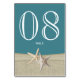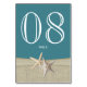 Starfish Tischnummer und Burpplappkarte zum Kompliment unseres Beach Amore Einladungs-Set im Aquamarinen Ozean, kann personalisiert und individuell bestellt werden. Alle Teile dieser Karte sind gedruckt. Es ist kein echter Einbruch oder keine Muscheln angebracht.