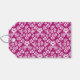 Hübsche Gastgeschenk Hochzeit Geschenk-Tag in einem violett rosa auf weißen Blumen Damast Muster getan. Die Grafiken eines weißen Textbereichs, auf der Vorderseite und eine violett rosa Stargazer-Lilie zieren die untere Vorderseite des Tags. Personalisieren Sie den violetten Text auf der Vorderseite des Geschenketiketts, um zu lesen, was Sie gewollt haben. Die passenden Hochzeitsprodukte stehen zur Verfügung.