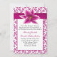 Elegante Blumen-Hochzeitseinladung, mit einem violetten Rosa auf weißem, blumengeschmücktem Damast-Muster, Grafik eines violett-rosa Satin-Band und einer schönen Stargazer-Lilie Blüte. Ein gerahmt weißer, rosafarbener Textbereich mit schwarzem und rosafarbenem Text, der für Ihren besonderen Tag individuell gestaltet werden kann. Matching Produkte sind erhältlich.