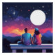 Ein schönes digitales Bild eines Paares, das nachts auf einem Dach sitzt und die Sterne ansieht. Der Himmel ist voller Sterne aller Farben, und die Milchstraße ist in der Ferne sichtbar. Das Ehepaar sitzt nah zusammen und sieht so aus, als würden sie sich gegenseitig die Gesellschaft und die Schönheit des Nachthimmels erfreuen.