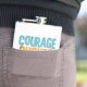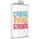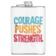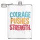 Das Design enthält den fett gedruckten Text "Courage Pushes Strength in einem dynamischen, graffit-style Schriftart. Die Welten werden in einer lebendigen, mehrfarbigen Palette dargestellt, die eine visuell auffällige und energetische Komposition schafft.