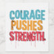 Das Design enthält den fett gedruckten Text "Courage Pushes Strength in einem dynamischen, graffit-style Schriftart. Die Welten werden in einer lebendigen, mehrfarbigen Palette dargestellt, die eine visuell auffällige und energetische Komposition schafft.