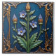 Art-Déco-Keramik-Fliesen mit blauen Blumen und grünen Blätter, umgeben von einem Kupfer-Deko dünnen gerundeten schwirren Rahmen, der Hintergrund ist dunkelblau.