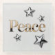 This is a pretty Starry Glass Peace Coaster. The coaster shows a holiday design of the word Peace in metallic gold letters on a pure white background. The text is glossy, centered and dimensional. There are four metallic silver stars. The stars have a glossy polished reflective quality with shadows in their centers. The stars are positioned at the top, right and bottom of the composition. The coaster is a square glass coaster. The coaster is 100% glass. The glass coaster is dishwasher safe.