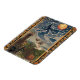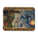 Aimant d'Halloween montrant une sorcière volant à travers un ciel étoilé au-dessus de champs avec des citrouilles, un chat noir et une chouette. La sorcière est décrite en étoiles. Ceci est tiré d'un design vintage d'Halloween de 1913.