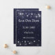 Personalisieren Sie eine einmalige Hochzeitsankündigung mit einer Starry Night Save the Date. Das Design der Ankündigung bietet einen Nachthimmel mit weißen Sternen und Text, den Sie mit Ihren Hochzeitsdaten personalisieren können. Zusätzliche Ankündigung Datum freihalten für dieses Design in verschiedenen Farben verfügbar.