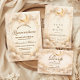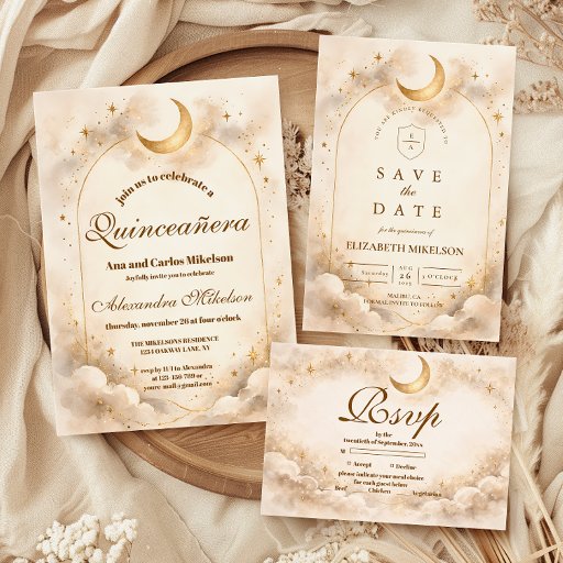 A luminous celestial design featuring delicate crescent moons and scattered constellation stars across a warm parchment background. A refined gold border frames the composition, while elegant script typography creates a graceful focal point worthy of such a meaningful milestone. The soft ivory and champagne tones give the entire piece a timeless, radiant glow. Perfect for a quinceañera celebration that feels romantic, elevated, and touched by starlight.