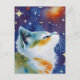 Die künstlerische Postkarte zeigt ein digitales Aquarellbild einer schönen Kalico-Katze mit kosmischem nächtlichen Hintergrund