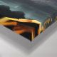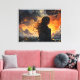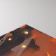 Ein junges Mädchen blickt auf einen hellorangen Sonnenuntergang, der einen Sternenhimmel in Brand setzt. Wolken rollen über den Horizont über eine fantastische Stadt mit Brücken, Türmen und beleuchteten Fenstern. Das Mädchen sitzt auf einem felsigen Hügel mit ihrem Rücken zum Betrachter, ihr braunes Haar weht im Wind. Die Bewegung in diesem Bild ist verführerisch, und eine Person kann nicht anders, als sich ihre Geschichte vorzustellen.