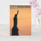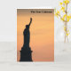 Die Vorderseite dieser Karte hat ein Bild der Freiheitsstatue, silhouettiert gegen einen schönen orangefarbenen Himmel, und das Innere hat das Gedicht der amerikanischen Dichterin Emma Lazarus namens The New Colossus: Nicht wie der dreiste griechische Riese, mit erobernden Gliedmaßen von Land zu Land; hier an unseren meerwaschen, Sonnenuntergang wird eine mächtige Frau mit einer Fackel stehen, deren Flamme der inhaftierte Blitz ist und ihr Name Exilmutter. Aus ihrem Leuchtfeuer Glows, die weltweit willkommen sind; ihre milden Augen beherrschen den Hafen, den zwei Städte umrahmen. "Behalt, uralte Länder, dein stacheliger Pomp!" weint sie mit stillen Lippen. "Gib mir deine müden, deine Armen, deine gequälten Massen, die sich danach sehnen, frei zu atmen, Das erbärmliche Weigerung deiner wimmelnden Küste. Schicken Sie mir diese, die Obdachlosen, den Sturm, ich hebe meine Lampe neben der goldenen Tür!" Sie schrieb das Gedicht 1883, um Geld für den Bau des Podest zu sammeln.