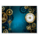 Türkis, strukturiert, Steampunkhintergrund mit Messing- und Goldgetrieben, Silberschlüssel und Uhr. Steampunkstil.