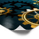 Türkis, strukturiert, Steampunkhintergrund mit Messing- und Goldgetrieben, Silberschlüssel und Uhr. Steampunkstil.