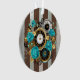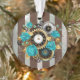 Patterned, antique watch, adorned with jewelry, gold hour hands and Latin numerals with turquoise roses on brown, striped background. Steampunk style.