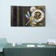 Antiquitäten mit Gold- und Messinggeräten, mit mechanischer Libelle auf braunem, gestreiften Hintergrund verziert. Steampunk.