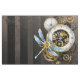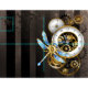 Antiquitätendiale mit Gold- und Messinggetrieben, mit mechanischer Libelle auf braunem, gestreiftem Hintergrund dekoriert. Steampunk.
