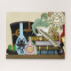 Grüner Drache in einer Teetasse, die auf einem Stapel Bücher steht. Top-Hut, Elixiere, ein Federstift mit Tinte und eine Uhr mit Gängen zeigen alles rund um den Drachen.