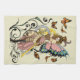 Eine blonde Steampunk-Fee mit rosa und blauen Flügeln. Die Fee trägt niedliches Outfit mit einem Top-Hut, Korsett und gestreiften Strümpfen, Schmetterlingen, Uhr, Gängen und Stammesdesign im hellgelben Hintergrund