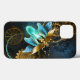 Steampunk glänzt mit blauen, transparenten Flügeln und grüner Glühbirne auf abgenutztem, braunem, strukturiertem Hintergrund. Steampunkstil.