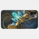 Steampunk glänzt mit blauen, transparenten Flügeln und grüner Glühbirne auf abgenutztem, braunem, strukturiertem Hintergrund. Steampunkstil.