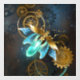Steampunk glänzt mit blauen, transparenten Flügeln und grüner Glühbirne auf abgenutztem, braunem, strukturiertem Hintergrund. Steampunkstil.