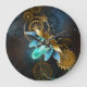 Steampunk glänzt mit blauen, transparenten Flügeln und grüner Glühbirne auf abgenutztem, braunem, strukturiertem Hintergrund. Steampunkstil.
