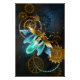 Steampunk glänzt mit blauen, transparenten Flügeln und grüner Glühbirne auf abgenutztem, braunem, strukturiertem Hintergrund. Steampunkstil.