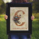 Plakatdruck mit einem Steampunk-Blumenbuchstaben und rostfreiem Metallausdruck "C" auf einem Vintagen Spitzen- und Pergamenthintergrund. Erhältlich in Print- und digitalem Download-Format.