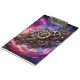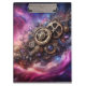 Dieses lebendige Steampunker-Fantasy-Uhrwerk entwirft in rosa und lila Strahlen über einen sternfüllten Nebel im Nachthimmel.