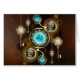 Turquoise lenses with antique watch with brass gears and golden keys on rusty, brown background. Steampunk style.