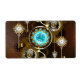 Türkisfarbene Linsen mit antiker Uhr mit Messinggetrieben und goldenen Tasten auf rostigem, braunem Hintergrund. Steampunkstil.