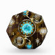 Türkisfarbene Linsen mit antiker Uhr mit Messinggetrieben und goldenen Tasten auf rostigem, braunem Hintergrund. Steampunkstil.
