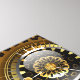 Türkisfarbene Linsen mit antiker Uhr mit Messinggetrieben und goldenen Tasten auf rostigem, braunem Hintergrund. Steampunkstil.