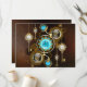 Türkisfarbene Linsen mit antiker Uhr mit Messinggetrieben und goldenen Tasten auf rostigem, braunem Hintergrund. Steampunkstil.