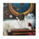 Weiße Furry Steampunk Katze mit seinem niedlichen braunen Hut und seiner Brille. Die Katze sitzt auf einer Theke oben in der Schiffsküche, gewartet für seine Teezeit. Hinter ihm liegt das Schiffsfenster, an dem ein Oktopus vorbeikommt.