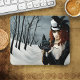 Steampunk viktorianische Rothaarin auf einem Winterspaziergang, um ihren Libellenboten mit einem Schlüssel freizulassen.
