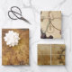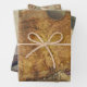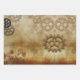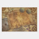 Stampunk-Designs, Packpapierblätter. Dieses dreiköpfige Set hat jeweils ein anderes Steampunk-Thema. Die Farben sind Vintag rostbraun und braun, die Gestaltung umfasst eine Weltkarte, Gänge, altmodische Fahrräder, Brillen und Uhren.