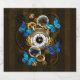 Zusammensetzung des runden Steampunkuhrs mit schwarz römischer Ziffernscheibe, mit Gold- und Messinggetrieben, blauen Morpho-Schmetterlingen und beschädigten Linsen auf braunem gestreiftem Hintergrund. Steampunkstil.