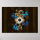 Zusammensetzung des runden Steampunkuhrs mit schwarz römischer Ziffernscheibe, mit Gold- und Messinggetrieben, blauen Morpho-Schmetterlingen und beschädigten Linsen auf braunem gestreiftem Hintergrund. Steampunkstil.