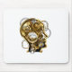 Konzeptioneller, mechanischer, menschlicher Kopf mit antiken Manometer und Metallgetrieben vor grauem industriellem Hintergrund. Steampunkstil.