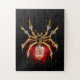 Mechanische Steampunkspinne mit Gold, Messinggetrieben und eine rote Glühlampe auf schwarzem Hintergrund. Steampunkstil.