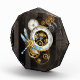 Antiquitätendiale mit Gold- und Messinggetrieben, mit mechanischer Libelle auf braunem, gestreiftem Hintergrund dekoriert. Steampunk.
