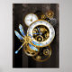 Antiquitätendiale mit Gold- und Messinggetrieben, mit mechanischer Libelle auf braunem, gestreiftem Hintergrund dekoriert. Steampunk.