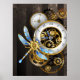 Antiquitätendiale mit Gold- und Messinggetrieben, mit mechanischer Libelle auf braunem, gestreiftem Hintergrund dekoriert. Steampunk.