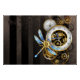 Antiquitätendiale mit Gold- und Messinggetrieben, mit mechanischer Libelle auf braunem, gestreiftem Hintergrund dekoriert. Steampunk.