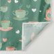 Ein charmantes Muster mit Teetassen, Teekannen und Herz, perfekt für Teeliebhaber. Weiche Pastelltöne auf einem warmen grünen Hintergrund schaffen ein gemütliches und einladendes Ambiente. Ideal, um jedem Raum eine Touch von Komfort und Wärme hinzuzufügen.