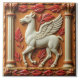 A square relief sculpture features a winged horse-like creature in the center, flanked by classical columns and surrounded by stylized foliage. The background is a solid orange color, providing a warm contrast to the other elements. The central figure is a quadruped with the body of a horse but with wings sprouting from its back. The creature is white with a smooth, glossy finish, suggesting it is made of ceramic or a similar material.