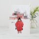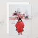 Kleines skandinavisches Mädchen in rot steht im Schnee mit einem altmodischen Bauernhaus im Hintergrund. Vintage Wasserfarbe der Kunst von Carl Larsson.