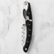Dieser Korkenzieher ist schwarz mit einer weißen Katze und einem flauschigen Schwanz, der auf den Klaviertasten stehend ist, auf beiden Seiten mit weißen Musiknoten.