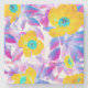 Heller floraler Untersetzer mit gelben, violetten und rosa Blüten. Perfekt zum Schutz von Tischen und gleichzeitig eine fröhliche Note in der häuslichen Dekoration und bei Partys.