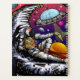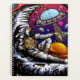 Originelle Vektorkunst eines Astronauten, der einen Mondkäse hat und eine Scheibe an eine Alien übergibt. Erstellt in Vektor.